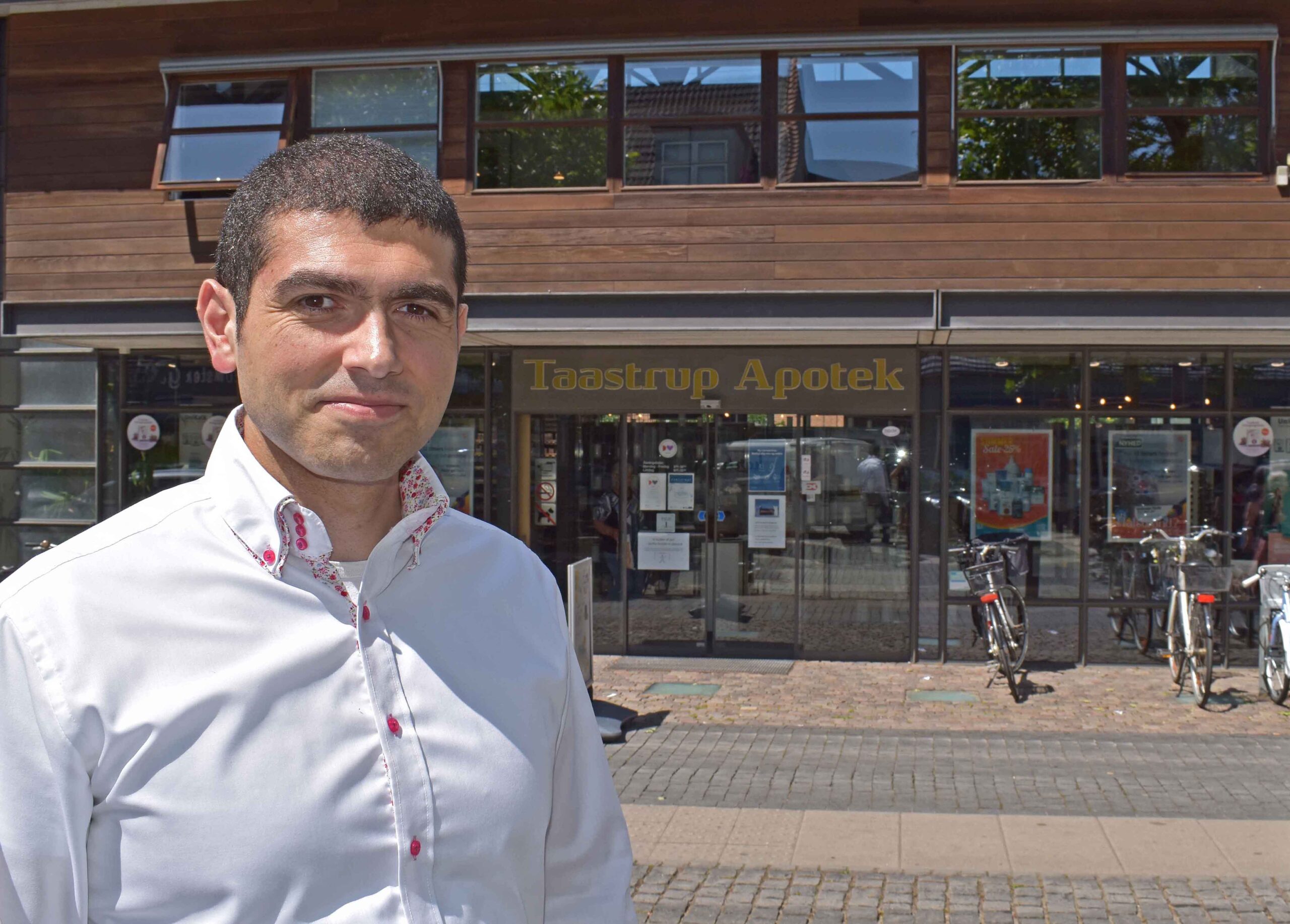 Behzad Ghorbani foran facaden på sit hovedapotek på Taastrup Hovedgade. Han har to andre apoteker i Høje Taastrup og Hedehusene.