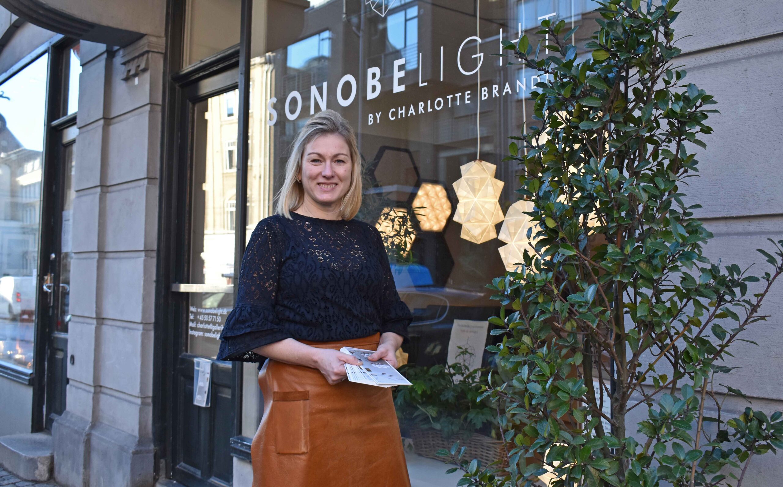 Mange passerer hver dag forbi Sonobe Lights butik på Frederiksberg. Charlotte Brandt har sat en plastholder op på den lukkede butiksdør med foldere om hendes produkter og må jævnligt fylde op med nye foldere.