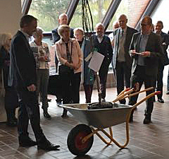 Michael Ziegler betragter gaven fra Erhvervsrådet, som blev overrakt af formand Kim Rasmussen og ledsaget med en forklaring på, hvordan kirsebærtræet og de medfølgende redskaber hver især relarerede til fødselarens politiske virke.