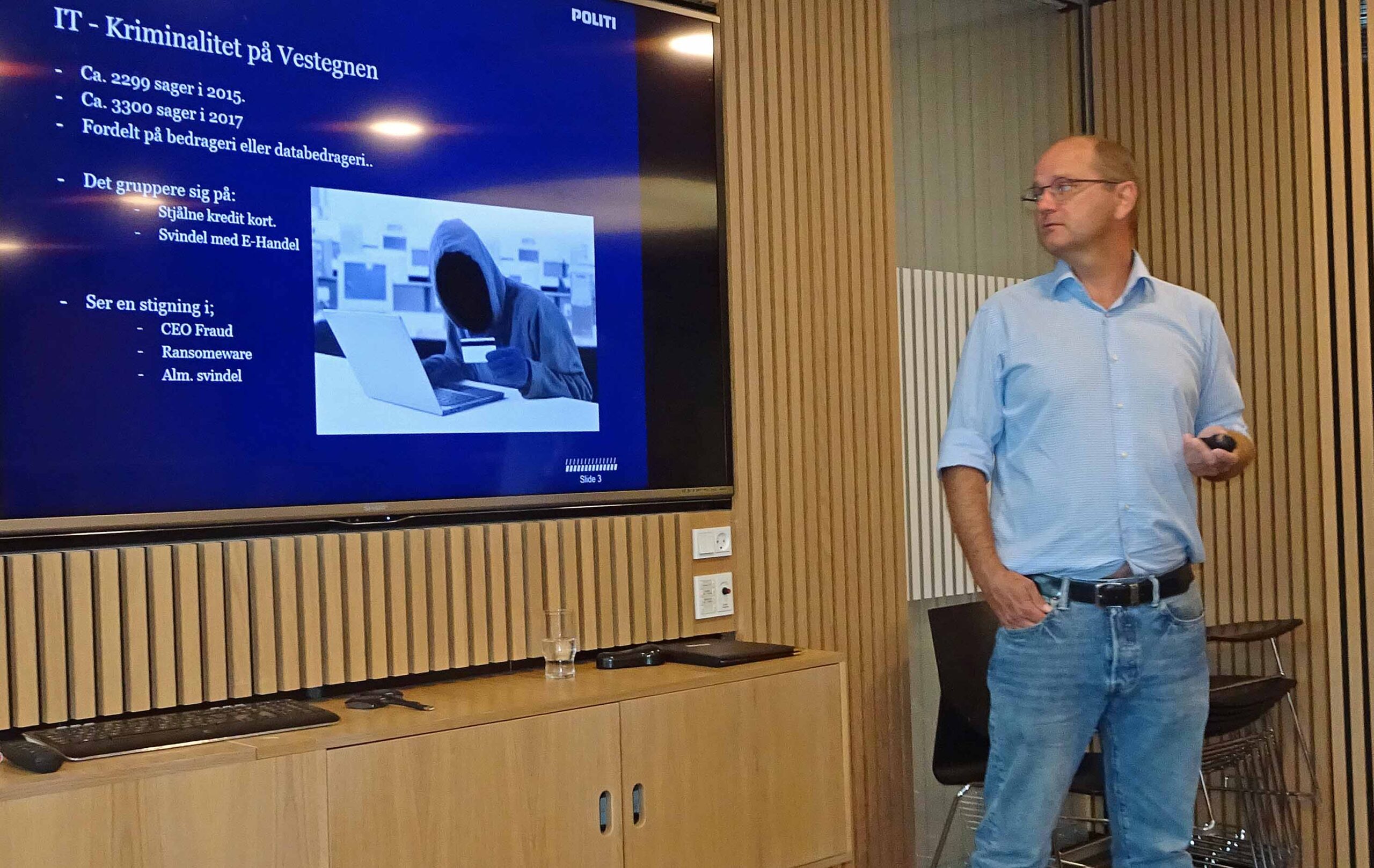 Thomas Sørensen fra Rigspolitiet gav gode råd til, hvordan man gør sig til at svært mål for it-kriminelle på morgenmødet, der blev holdt på rådhuset.