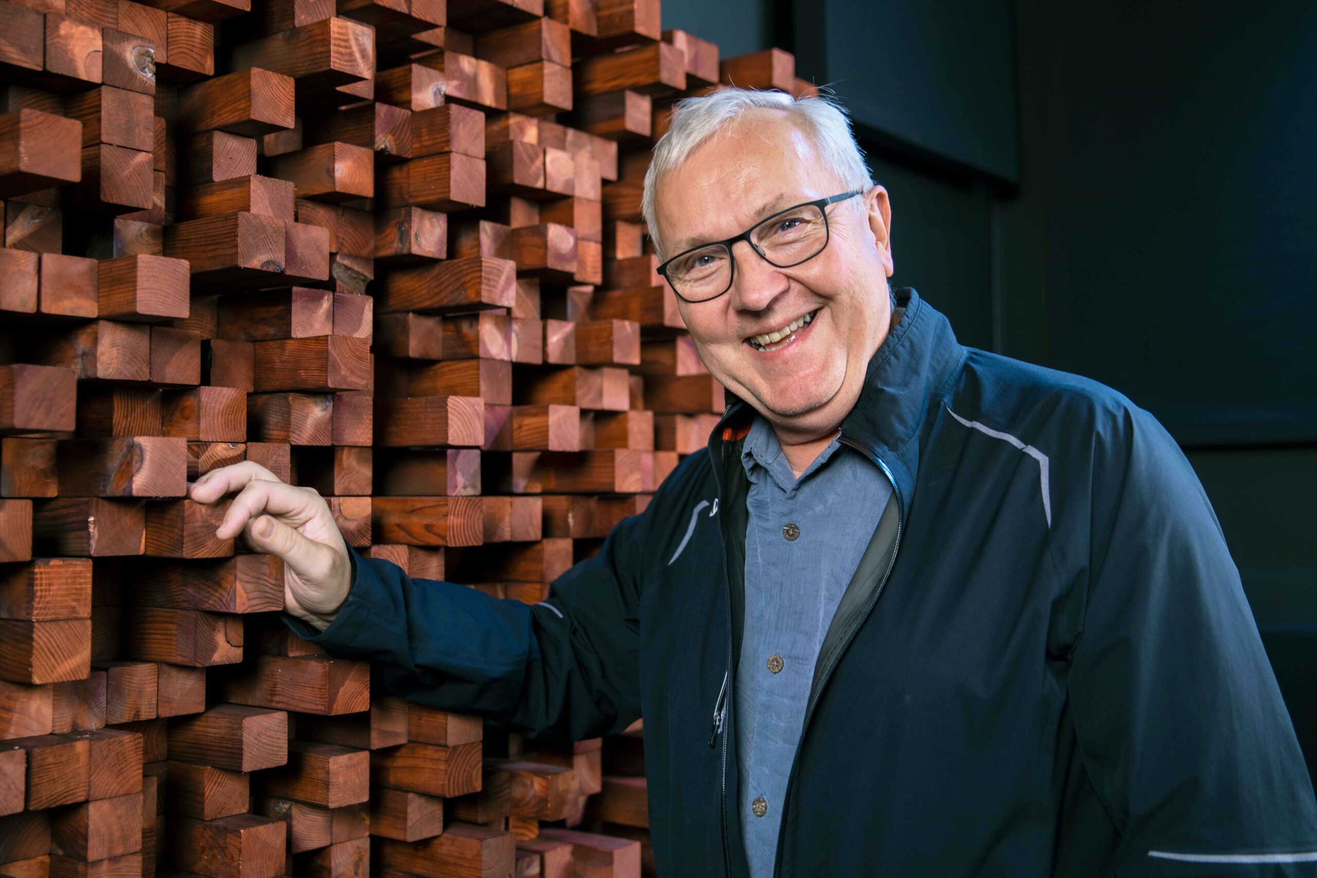 Birger Hauge i tv-studiet med en Skyline Difuser fremstillet af en dansk snedker for at optimere akustikken i rummet.