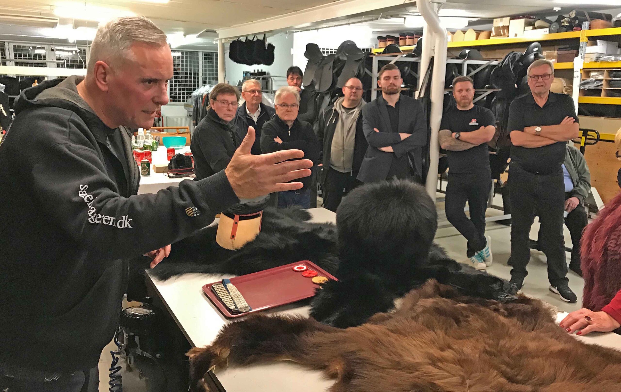 Huerne fremstilles af skind fra canadiske sortbjørne (se udstoppet model bagest i billedet). Bestanden er så stor, at den må reguleres, og der er tale om en fuldt bæredygtig produktion, oplyste Brian Rützou.